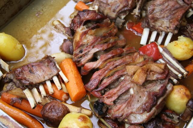 Hozzávalók: (30 főre): 50 dkg házi füstölt szalonna, 1 fakanál sertészsír, 1,5 kg vöröshagyma, 2,5 kg szárazbab, 2 erős paprika, 5 babérlevél, fél liter lecsó, 3,5 kg marhalábszár, só, csípős fűszerpaprika, őrölt feketebors, 1 fej fokhagyma, teáskanálnyi őrölt kömény, 1 evőkanál mustár, fél liter száraz vörösbor.