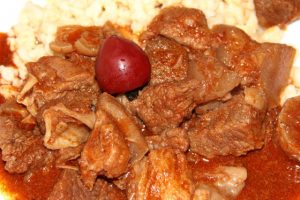 A közel egyforma darabokra vágott húst bográcsba tesszük. A vöröshagymát, paprikát, paradicsomot felkockázzuk, a fokhagymát átpréseljük.
