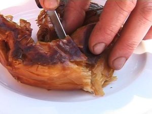 A réteslapokat kiterítjük, egy adaghoz kettőt egymásra helyezünk. Meglocsoljuk olívaolajjal (étolajjal, vagy olvasztott zsírral). Egyik végére hosszában felhalmozzuk a juhtúrót, majd nagylyukú reszelőn sajtot reszelünk rá. Feltekerjük, csigába összehajtjuk, kicsit megnyomjuk a tenyerünkkel a tetejét. Olajat hevítünk, és mindkét oldalán aranyos barnára sütjük.