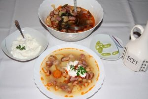 Hozzávalók: (8 főre) 50 dkg csicseriborsó, 2 sárgarépa, 2 petrezselyem, 1 zellergumó, 1 vöröshagyma, 1 füstölt csülök, 3 krumpli, só, 4 babérlevél, kis csokor zeller-és petrezselyemzöld, 1 kávéskanál őrölt bors, 3 gerezd fokhagyma. A rántáshoz: 1 evőkanál zsír, 4 gerezd fokhagyma, 2 evőkanál liszt, 3 kávéskanál őrölt paprika. A csipetkéhez 1 tojás, liszt. Tálaláshoz csípős paprika, ecet, tejföl.