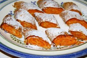 Az elsőket párolt répával gazdagon megszórjuk, feltekerjük, a végeit kicsit becsípjük, nehogy kifolyjon a töltelék sütés közben. Kizsírozott tepsibe helyezzük.
