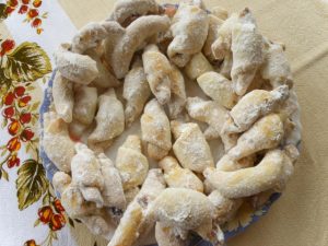 Hozzávalók: 1 kg liszt, 2 dl tejföl, 40 dkg sertészsír, 10 dkg porcukor, 3 vaníliás cukor, 5 dkg élesztő, 1 dl tej, 1 tojás, 15 dkg szilvalekvár. A sütemények díszítéséhez további 15 dkg porcukor.