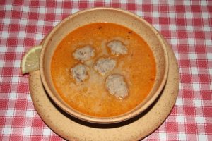 Hozzávalók: 60 dkg marhacsont. 40 dkg vegyes zöldség: sárgarépa, petrezselyem, zeller, karalábé, krumpli, 2 fej vöröshagyma, 2 gerezd fokhagyma. 1 evőkanál szemes bors, só, 1 citrom. A habaráshoz: 4 dl tejföl, 5 dkg liszt. A gombóchoz: 10 dkg sertéshús, 10 dkg marhahús, 5 dkg füstölt kolbász, 3 dkg füstölt szalonna, 25 dkg krumpli, 1 tojás, só, őrölt bors.