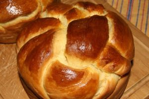 További fél óráig a fazékban kelesztjük, majd tojással átkenjük a tetejét. Előmelegített sütőben, vagy kemencében szép pirosra sütjük. Amikor kivesszük, cukros vízzel még átkenjük, hogy szép fényes legyen.