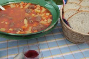 Hozzávalók: (15 főre) 10 dkg sertészsír, 25 dkg vöröshagyma, 1 kg vegyes zöldség (zeller, petrezselyem, sárgarépa), 1 nagy csokor zeller zöld, 1,5 kg krumpli, 1,5 kg friss töltésű kolbász, 35 dkg árpagyöngy (gersli). Az ízesítéshez: 1 dl házi paradicsomlé, 2 teáskanál őrölt kömény, 1 teáskanál őrölt feketebors, 2 dkg őrölt fűszerpaprika, 4 teáskanál házi darált paprika, só.