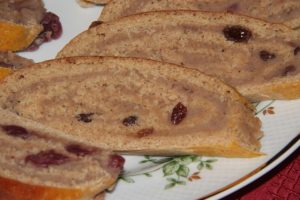 Hozzávalók: (3 rúdhoz) 1 kg (tönköly) liszt, 5 dkg élesztő, 1 liter tej, 1 teáskanál (gyümölcs) cukor, diónyi vaj, 1 kávéskanál só, 2 evőkanál vegyes virágméz, 1 kg gesztenyemassza, 15 dkg magozott meggy, 10 dkg mazsola, 1 dl rum. A tészta tetejére 2 tojás sárgája.