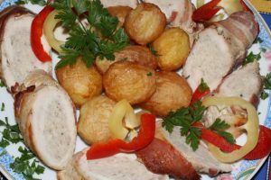 A darált húst a gesztenyemasszával, egy tojással, főzőtejszínnel, teáskanálnyi sóval és borssal elkeverjük. A húsok közepére evőkanálnyi tölteléket halmozunk. Feltekerjük, és beburkoljuk vékony szeletekre vágott szalonnával. Vékonyan kiolajozott sütőedénybe tesszük. A megmaradt töltelékből pogácsákat formázunk, és a hús mellé tesszük. Amíg a hús átpárolódik, lefedve sütjük, majd a tetőt (fóliát) levéve megpirítjuk.
