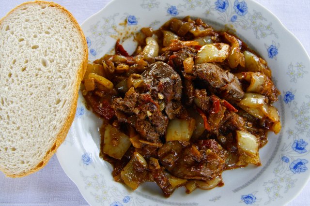 A húst ferdén szeletelve tesszük tányérra, és a krumplival együtt tálaljuk.