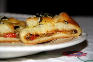 Hozzávalók: 1 kg liszt, 7,5 dl tej, 5 dkg élesztő, 10 dkg vaj, fél dl étolaj, 3 evőkanál tökmagolaj, 1 evőkanál cukor, 2 teáskanál só, 1 tojás. A töltelékhez: 15 dkg vegyes gomba, 2 vöröshagyma, 3 gerezd fokhagyma, 3 teáskanál őrölt paprika, 1 evőkanál sertészsír, 1 teáskanál só, 1 kicsi paprika, 1 paradicsompaprika. A tetejére: 1 tojás, 5 dkg tökmag. A tepsi kikenéséhez zsír.