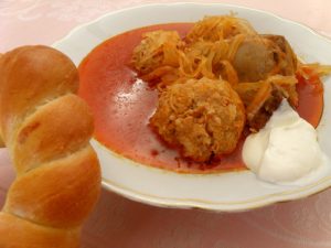 Hozzávalók: 60 dkg darált sertéshús, másfél kg savanyú káposzta, 1 kg oldalas, 3 tojás, 10 dkg rizs, só, 2 teáskanál őrölt paprika, 1 teáskanál őrölt bors, 3 gerezd fokhagyma, 1 kis fej vöröshagyma, 6 babérlevél, 10 szem egész bors, 3 dl paradicsomlé, 2 dl tejföl. A rántáshoz: 2 evőkanál zsír, 2 evőkanál liszt, 3 teáskanál őrölt paprika.
