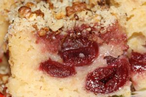 A megkelt tésztát kikent, vagy sütőpapírral kibélelt tepsibe öntjük, tetejére magozott meggyet, cukros diót, és vágott diót szórunk, és megsütjük.