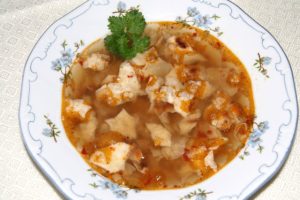 Hozzávalók: 1 evőkanál zsír, 1 nagy fej vöröshagyma, 1 teáskanál őrölt paprika, 2 gerezd fokhagyma, 1 csokor petrezselyem-és zeller zöld, 1 tv-paprika, 3 teáskanál paprikakrém, só, 1 kávéskanál őrölt feketebors. A laksához: 10 dkg liszt, víz. A kukorica kockához: 3 evőkanál kukoricaliszt, 2 evőkanál kukoricadara, 2 dl víz, 1 evőkanál zsír, só.