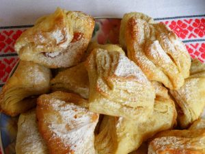 Utolsó nyújtás után négyzeteket vágunk belőle, közepébe lekvár halmocskákat teszünk, sarkosan felhajtjuk, és forró sütőben megsütjük.