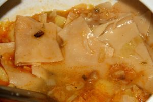 Hozzávalók: 10 dkg füstölt szalonna, 20 dkg lebbencstészta, 50 dkg krumpli, 20 dkg kelkáposzta, 2 vöröshagyma, 1 csokor petrezselyem, 1 teáskanál só, 2 teáskanál őrölt paprika.