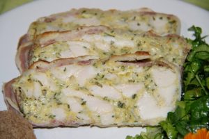 Hozzávalók: (1 püspökkenyér formába, 4 főre) 50 dkg csirkemell, 3 evőkanál tejföl, 3 tojás, 3 evőkanál liszt, 1 teáskanál só, csipetnyi őrölt feketebors, 1 kávéskanál házi ételízesítő, bazsalikom, zeller, petrezselyemzöld, 20 dkg füstölt szalonna, 20 dkg reszelt sajt. A salátához: tyúkhúr, saláta, gyermekláncfű, uborka, lucerna, édeskömény, rukkola, 2 evőkanál cukor, 1 kávéskanál só, csipetnyi bors, 1 evőkanál olívaolaj, fél citrom leve.