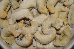 Előmelegített sütőben, közepes tűznél világosra sütjük. Még melegen megforgatjuk vaníliás porcukorban.