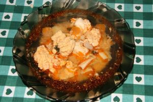 Hozzávalók: 50 dkg krumpli, 3 sárgarépa, 1 petrezselyem gyökér, 1 zeller, 1 csokor zeller zöld, 3 babérlevél, 1 teáskanál őrölt paprika, 1 kávéskanál őrölt feketebors, csipetnyi őrölt kömény, 2 teáskanál só, 1 gerezd fokhagyma, 20 dkg pontyfilé, 60 dkg halikra, 2 teáskanál só, 1 paprika, 1 paradicsom, 2 vöröshagyma, 10 dkg orsótészta, fél dl étolaj.