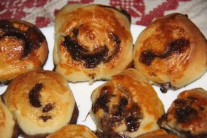Hozzávalók: 35 dkg liszt, 1 teáskanál cukor, fél dl tej, 3 dkg élesztő, 2 tojás sárgája, 3 dkg porcukor, csipetnyi só, 2 dkg vaj, 8 dkg zsír. A töltelékhez: 15 dkg vaj, 15 dkg porcukor, 2 evőkanál kakaó, 1 csomag vaníliás cukor, 5 dkg mazsola. A tetejére: 1 tojás sárgája, fél dl tej, 1 evőkanál cukor.