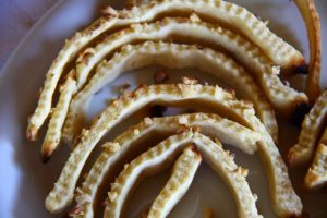 A cipókat kisodorjuk, és derelyevágóval két centi széles csíkokra felvágjuk. Hossza kb. egyezzen meg a sütőforma szélességével. A tésztacsíkokat az előkészített forma bordáira helyezzük, egymástól kis távolságot tartva, nehogy összesüljenek.