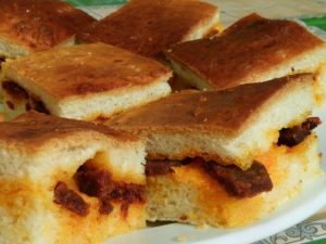 A maradék két tésztát úgy készítjük el, mint a kalácsot. Egyenként kisodorjuk, rászórjuk a maradék kolbászdarabkákat és a sült szalonnát, majd kevés zsírral is meglocsoljuk. A tészta két oldalát felhajtjuk, és hosszában feltekerjük. A második tepsibe tesszük, a két rúd között kicsit zsírral megkenjük, nehogy összesüljenek. Mindegyik pompos tetejét felvert tojással átkenjük. Kicsit még pihentetjük, és előmelegített sütőben fél óra alatt megsütjük.