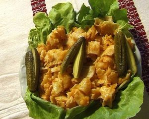 A kifőtt tésztát hideg vízzel leöblítjük, hogy ne ragadjon, és a krumplihoz keverjük.