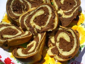 A megkelt tésztákból először kisodrunk egy világosat, ráterítjük a megmaradt mazsola harmadát kevés porcukorral elmorzsolva, hogy a tésztát ne nedvesítse meg. Ráhelyezünk egy barna cipót, és együtt, egyforma téglalap nagyságúra kinyújtjuk. Hosszában feltekerjük, és úgy helyezzük a sütőformába. A másik két tésztát ugyanígy készítjük el. Még fél órát pihentetjük, tetejüket felvert tojással átkenjük, és csak ezután helyezzük az előfűtött kemencébe, vagy sütőbe.