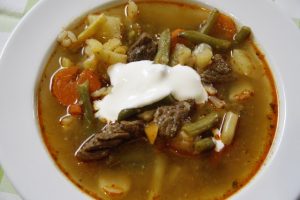 Hozzávalók: (10 főre) 1,4 kg marhalapocka, 3 vöröshagyma, 1 fakanál zsír, 3 burgonya, 2 fej fokhagyma, 3 teáskanál őrölt paprika, 1 kávéskanál őrölt feketebors, 2-3 teáskanál só, 1 evőkanál paradicsompüré, 5 sárgarépa, 3 petrezselyemgyökér, fél gumó zeller, 50 dkg karfiol, 50 dkg sárga-és zöldbab, 10%-os ecet, 2 teáskanál lestyán.