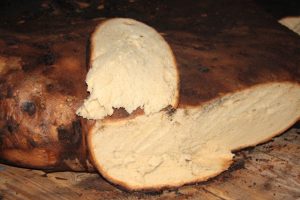 A kosárból nagy sütőlapát segítségével lehet a jól felfűtött, vizes ruhával kipemetelt kemencébe helyezni. Négy óra szükséges egy ilyen hatalmas kenyér sütéséhez. Amikor elkészült, a tűztérből kihúzva a feketére égett, külső részét le kell ütögetni, illetve faragni. Így kapjuk meg a szép, ropogós héjú kemencés kenyerünket, amelynek az íze páratlan.