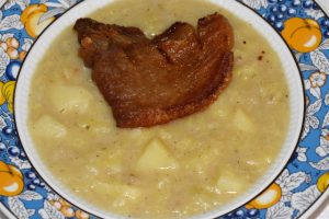 Hozzávalók: 1 nagyobb fej kelkáposzta, 3 nagy szemű krumpli, só, őrölt feketebors, 4 evőkanál liszt, 60 dkg füstölt császárszalonna, fél dl étolaj.