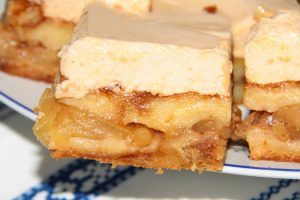 Közben a fehérjét húsz deka porcukorral és hét evőkanál baracklekvárral habbá verjük, és a tészta tetejére simítjuk.