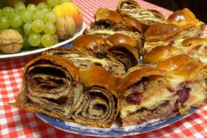 3 gombócot tepsi nagyságúra kisodrunk. Mindhármat megkenjük kakaós krémmel, és egyenként, rúd alakban szorosan feltekerjük, majd copfba összefonjuk. A végeit összenyomjuk, és kizsírozott tepsibe tesszük. Még egy ugyanilyet készítünk. A harmadikat diós-meggyes töltelékkel kenve tekerjük fel, és tesszük a másik kettő mellé.