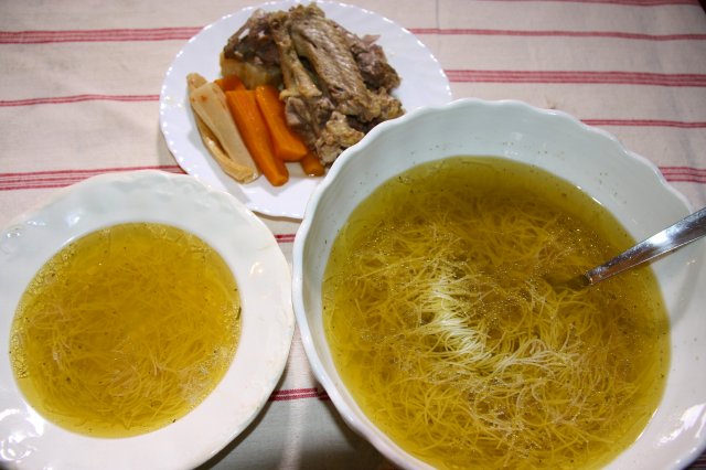 A felforrt leves habját leszedjük. A vöröshagymát egészen apróra vágva adjuk hozzá, majd fűszerezzük babérlevéllel, és egy kevés sóval.