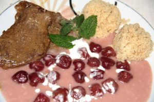 Hozzávalók: 8 szelet marhacomb, 1 teáskanál őrölt feketebors, 2 teáskanál só, 1 dl mustár, 3 dl étolaj. A szószhoz: 1 kg meggy, 8 evőkanál cukor, 1 teáskanál só, 1 teáskanál őrölt fahéj, 1 kávéskanál őrölt szegfűszeg, 5 dl főzőtejszín, 5 evőkanál liszt. A darához: 50 dkg búzadara, 1 dl étolaj, csipetnyi só, 2 dl meleg víz.