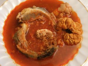 A vöröshagymát apró darabokra vágjuk. Hozzászeljük a fokhagymát, és lábosban 2 teáskanálnyi sóval meghintjük. 10 percig állni hagyjuk, hogy levet eresszen. A zöldpaprikát kis kockákra vágva hozzákeverjük. Az erős paprikákat a magos rész kivételével szintén feldaraboljuk, és beleborítjuk. Rátesszük a hal fejeket, és farkakat. Felöntjük annyi hideg vízzel, hogy ellepje a húsokat, majd fűszerezzük borssal és paprikakrémmel. Másfél óráig főzzük. Amikor átpuhultak a húsok, a farok részt kivesszük, kihűtjük, kifilézzük, és villával összetörjük. A többit visszatesszük, és fakanállal nyomkodjuk, hogy teljesen szétfőjön a fejrész. Kiszedjük a csontokat, és négy literre felszaporítjuk vízzel a levét. Hozzáadjuk a kicsontozott, áttört halhúst, felforraljuk, ízlés szerint sózzuk, és belefőzzük a fűszerpaprikát. A besózott halszeleteket folyó víz alatt alaposan átmossuk, és a belsőségekkel együtt a halászlébe tesszük. 10-15 perc alatt készre főzzük.
