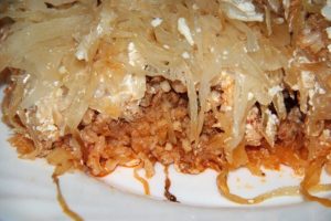 A tepsi aljában elterítünk egy sor dinsztelt káposztát, meglocsoljuk kevés zsírral, tejföllel, majd beborítjuk a rizs felével. Rátesszük a pörköltet, a megmaradt rizst, vastagon átkenjük tejföllel, és befedjük a félretett káposztával. A tetejét is tejföllel és zsírral locsoljuk, majd kb. 40 perc alatt készre sütjük.