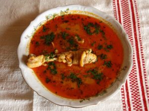 Hozzávalók: 1 db fiatal csirke darabolva, 1 vöröshagyma, 1 paprika, 1 paradicsom, 1 nagyobb sárgarépa, 1 petrezselyemgyökér, fél zeller, 1 csokor zellerzöld, 1 evőkanál őrölt paprika, 2 teáskanál só, 1 teáskanál őrölt feketebors, 5 dkg zsír, 2 babérlevél, 1 csokor petrezselyemzöld, 2 dl tejföl, 1 teáskanál liszt. Csipetkéhez: 1 tojás, csipetnyi só, liszt.