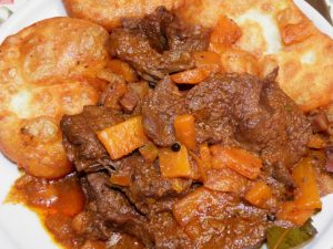 Hozzávalók: A pácléhez: 2 dl vörösbor, 1 dl étolaj, 1 fej vöröshagyma, 5 gerezd fokhagyma, 1 teáskanálnyi koriander, borókabogyó, mustármag, szegfűbors, 5 db babérlevél. 1 kg marhalábszár, 1 dl étolaj, 10 dkg füstölt szalonna, 1 púpos evőkanál őrölt paprika, 5 db sárgarépa, 2 dl vörösbor, só. A lángoshoz: fél dl tej, 1 kávéskanál cukor, 2 dkg élesztő, 30 dkg burgonya, 40 dkg liszt, só, a sütéshez étolaj.