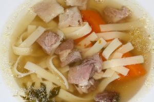 Hozzávalók: 50 dkg füstölt sonka, 20 dkg metélttészta, 2 sárgarépa, 2 petrezselyem gyökér, 1 paprika, 1 zellergumó, 1 vöröshagyma, 2 gerezd fokhagyma, 1 teáskanál őrölt feketebors.