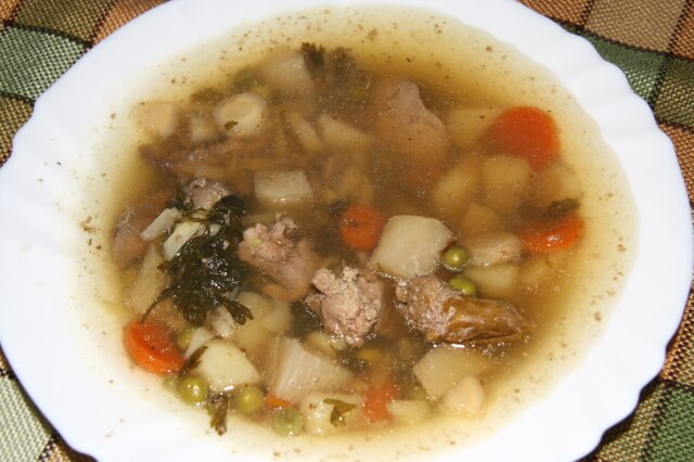 Amikor a leves felforrt, a habját leszedjük, és bezöldségeljük. Ezzel együtt, lassú tűzön hosszasan főzzük, mint a húslevest. Őrölt feketeborssal fűszerezzük.