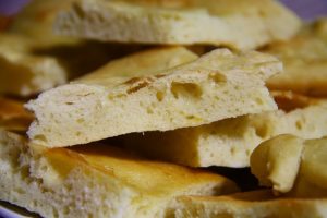A megkelt tésztát lisztezett deszkán kézzel széthúzzuk, és beletesszük a sütőformába. Itt még tíz percig pihentetjük, utána betehetjük az előmelegített sütőbe. Húsz-harminc perc alatt szép színesre sül. Amikor kivettük, enyhén sós, olajos vízzel átkenjük a tetejét.