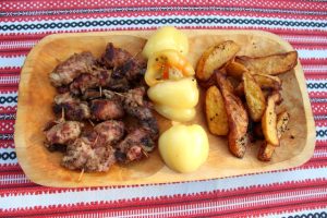 Hozzávalók: 50 dkg csirkemáj, 25 dkg vékonyra vágott (bacon) szalonna, 1,5 dl mustár, 3 gerezd fokhagyma, 1 teáskanál fokhagymapor, 1 teáskanál őrölt kömény és őrölt feketebors, egy deci étolaj, 30 dkg sertészsír, 1 kg krumpli, só.