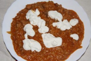 Hozzávalók: 3 evőkanál étolaj, 1 vöröshagyma, 3 gerezd fokhagyma, 75 dkg savanyú káposzta, 60 dkg sertés lapocka, 20 dkg füstölt sonka, 2 babérlevél, fél marék rizs, 1 teáskanál só, 1 teáskanál őrölt kömény, 2 kávéskanál őrölt feketebors, 5 teáskanál őrölt paprika. A habaráshoz: 2 dl tejföl, 2 evőkanál liszt.