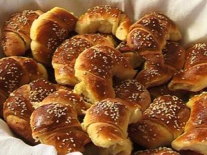 Utána a megkelt bucikat kerekre kinyújtjuk. A margarint 2 teáskanál sóval kikeverjük, és megkenjük vele a tészták tetejét. A lapokat nyolc cikkre vágjuk (mint a tortát), és kifli alakban (a szélesebb végétől indulva) feltekerjük. Kizsírozott tepsibe tesszük, és újra pihentetjük. Amikor megkelt, tetejüket tojás sárgájával lekenjük, és szezámmaggal megszórjuk. Negyed órát még állni hagyjuk, és előmelegített sütőben szép aranyos barnára sütjük.
