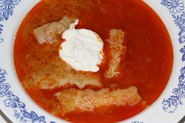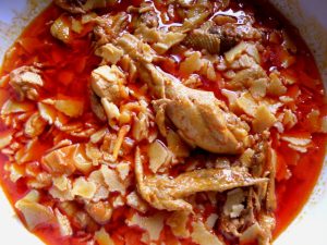 Hozzávalók: (10 főre) 30 dkg liszt, 2 tojás, 1 fakanál sertészsír, 3 vöröshagyma, egy egész, kb. másfél kilós csirke, só, 3 evőkanál őrölt paprika, 2 zöldpaprika.