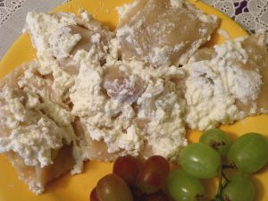 Hozzávalók: 3 marék liszt, só, 2 kanál sertészsír, egy nagyobb fürt édes szőlő, 50 dkg túró, 2 evőkanál cukor, 1 evőkanál tejföl.