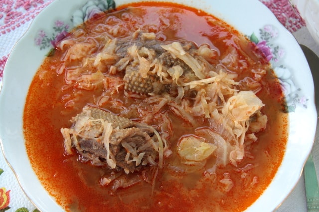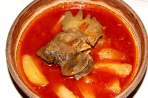Hozzávalók: 1 kakas húsa, 5 vöröshagyma, 4 paprika, 3 paradicsom, 1 csípős paprika, 2 teáskanál őrölt paprika, 1 teáskanál őrölt csípős paprika, 1 púpos teáskanál só, 2 fakanál sertészsír, másfél kg krumpli.