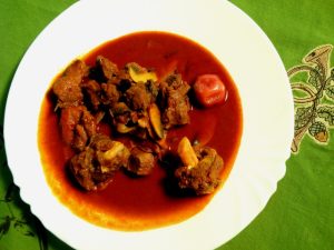 Hozzávalók: (10 főre) 3 kg szarvas nyak, comb és borda, 1 evőkanál sertészsír, 30 dkg vöröshagyma, 3 babérlevél, 1 paradicsom, 1 zöldpaprika, 15 dkg gomba, teáskanálnyi őrölt fehérbors, 3 evőkanál őrölt paprika, 1 gerezd fokhagyma, só, 1 dl tejföl, 1 csapott evőkanál liszt, 10 db csípős cseresznyepaprika.