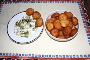 Hozzávalók: A salátához: 1 nagyobb fej saláta, 20 dkg füstölt szalonna, 4 gerezd fokhagyma, só, 2 dl tejföl. Öntet: 2 dl víz, 2 teáskanál cukor, 1 evőkanál ecet, csipetnyi só. A puffancshoz: 30 dkg krumpli, 30 dkg liszt, 1 tojás, 2 kávéskanál só, 2,5 dkg élesztő, 2 dl tej, 1 teáskanál cukor, a sütéshez étolaj.
