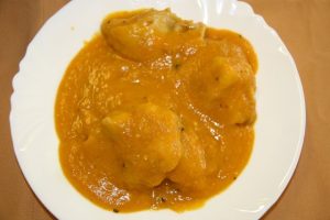 A csirkehúsokat kétfelé vágva visszahelyezzük a vadas mártásba, és a zsemlegombócokkal tálaljuk.