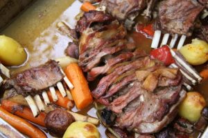 Disznózsírt kenünk a húsok tetejére, borssal megszórjuk, és aláborítjuk a bort. A tepsit lefedjük, és betoljuk a jól felfűtött kemencébe, két-három órára. Sütés közben néhányszor a pecsenye lével megöntözzük. Amikor már megpuhult, a fedőt levesszük róla, és pár percre visszatoljuk, hogy szép piros legyen a pecsenyénk.